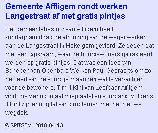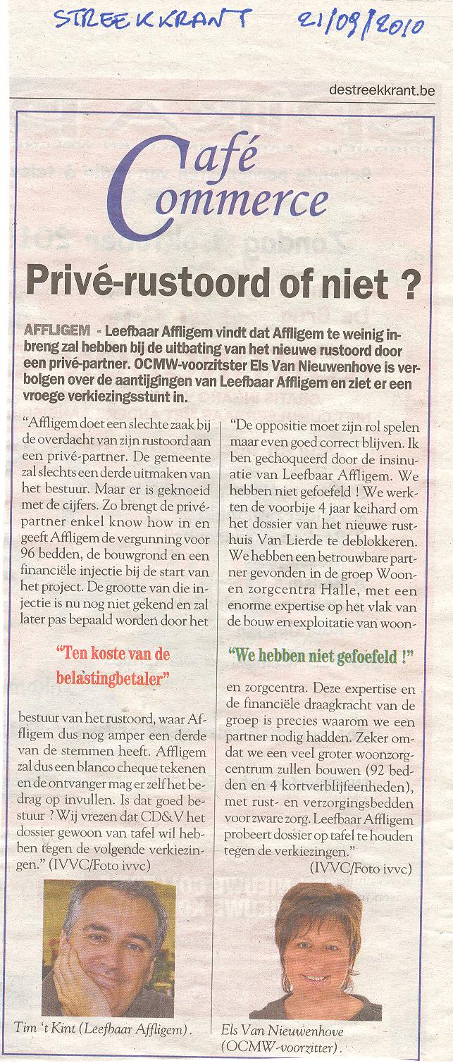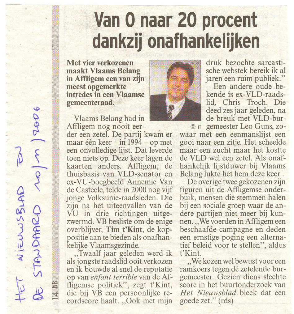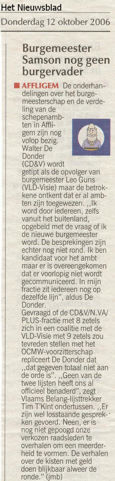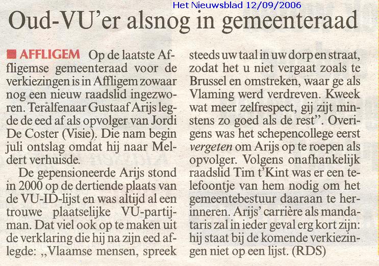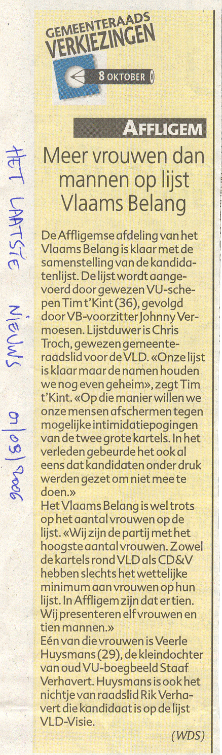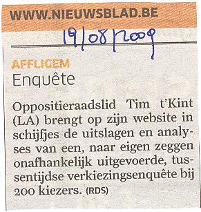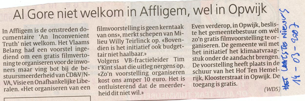 "Ik kan niet anders dan constateren dat de officiële organisatoren, namelijk "Vrouw en Maatschappij" slechts een vehikel is van de CD&V. De reclame voor de voordrachten staan op de webstek van CD&V Affligem en het logo van de organisatoren bestaat uit een samengaan van het CD&V-logo met een tekst "vrouw & maatschappij" in dezelfde huisstijl. Verder noemt de vereniging zich op haar eigen webstek zelf ook "de politieke vrouwenbeweging van CD&V". Naar de letter van het reglement van de cultuurraad is dit misschien koosjer te noemen, maar ik vraag me af of het naar de geest is van dat reglement. Vindt de CD&V dat ze de budgetten die de gemeente voorbehouden heeft voor cultuur moet gebruiken om één van haar zuilen te onderhouden terwijl de CD&V al een meer dan behoorlijke dotatie ontvangt vanuit haar verschillende parlementaire fracties én sinds ze in Affligem ook nog eens het grootste deel van de mandaten binnengehaald heeft ? Als je op alle publicaties van "Vrouw & Maatschappij" ook je partijlogo zet, dan is dat niet kies. Zeker niet als (omwille van een bepaling in het reglement) ook nog eens staat vermeld dat het in samenwerking is met het gemeentebestuur van Affligem. Dat is, zeker naar de bevolking toe, géén goede communicatie. Of misschien net wel, omdat het duidelijk maakt dat men hier een aantal zaken vermengt die men beter gescheiden zou houden. Ik vind het alvast jammer dat CD&V zich voor zo'n laag bedrag (€ 125 per lezing) laat kennen en hoop dat men in de toekomst zal afzien van dit soort misbruik van een anders zeer deugdelijk systeem vaan subsidiëring van al wie aan cultuur doet in Affligem. Wat is het standpunt van de schepen en de burgemeester hieromtrent ? "